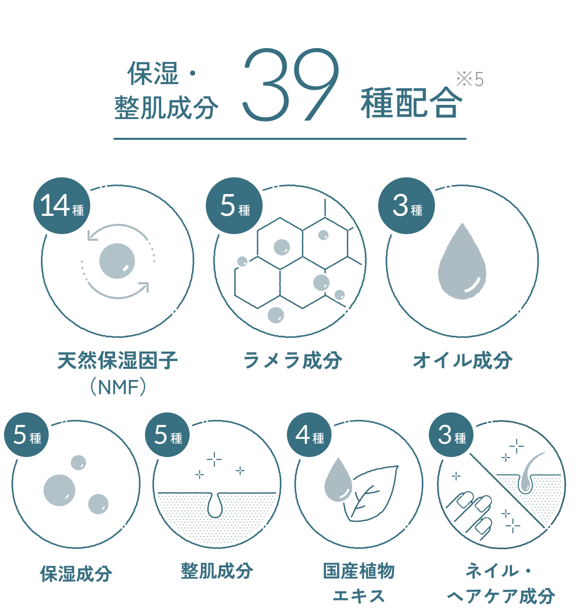 ヒアルロン酸Na※2や3種のヒト型セラミド※3、加水分解ケラチン(羊毛)※4、ナイアシンアミド※2や肌を整える国産の植物由来エキス※4など爪・髪・肌の保水・肌荒れ防止などに特化した計39種類の保湿・整肌成分※5を配合。