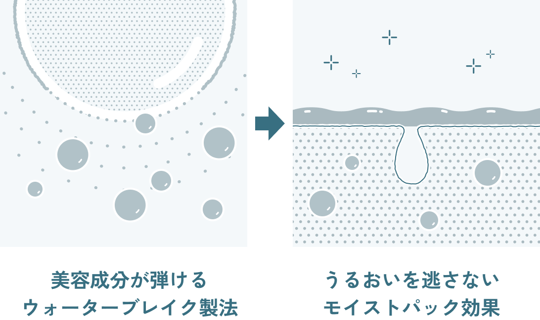 肌に塗り広げるとジェルが美容液に変化し、美容液が弾けて角質層まで浸透するウォーターブレイク製法を採用。さらにオイル成分が保湿性成分の蒸発を防ぎ、お肌を保護するモイストパック効果に繋がります。しっかりうるおいを届けながらもベタつきにくく、重いテクスチャーが苦手な方でもご使用いただきやすくなっています。