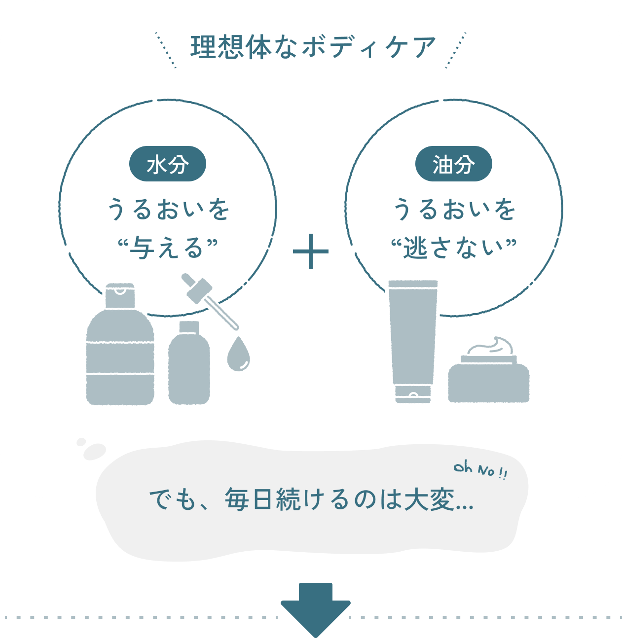 「ボディケア」と聞くと、クリームやオイルをイメージする方が多いのではないでしょうか。でも実は、クリームやオイルは油分でうるおいを「逃さない」ことに優れているため、これだけでケアしていると、水分を補い保湿することなく、いきなりお肌に蓋をしてしまうことに。